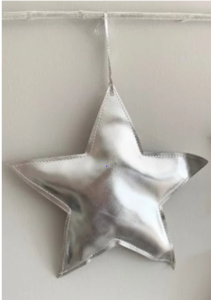 a cinque punte di materiale tessile contenente delle fibre metalliche ed altre, imbottita con materiale sintetico, che misura circa 8 cm x 8 cm. Ad una delle punte della stella è fissato un anello di filo metallizzato per appenderla.