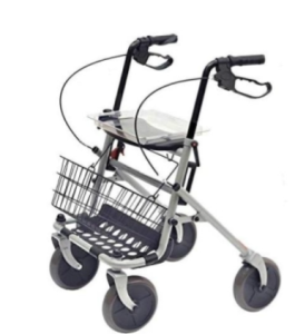 Deambulatore rollator a quattro ruote, con struttura tubolare in alluminio, dotato di ruote anteriori girevoli, manopole e freni. È provvisto di sedile/vassoio e cestino. Può essere piegato per essere trasportato.
